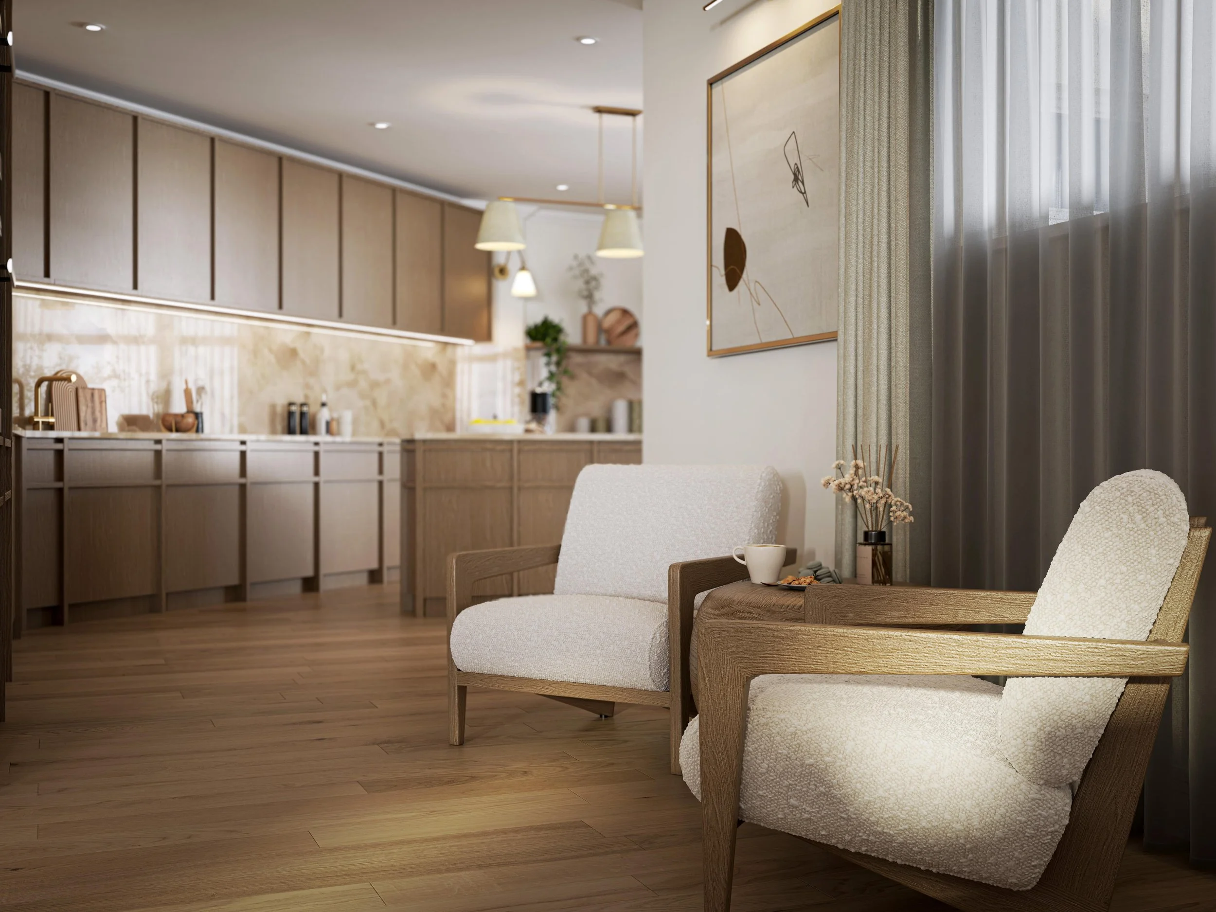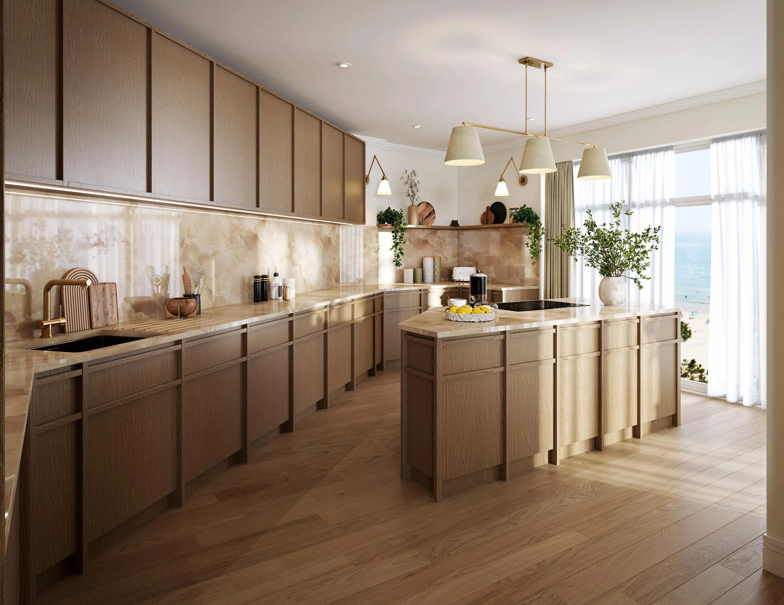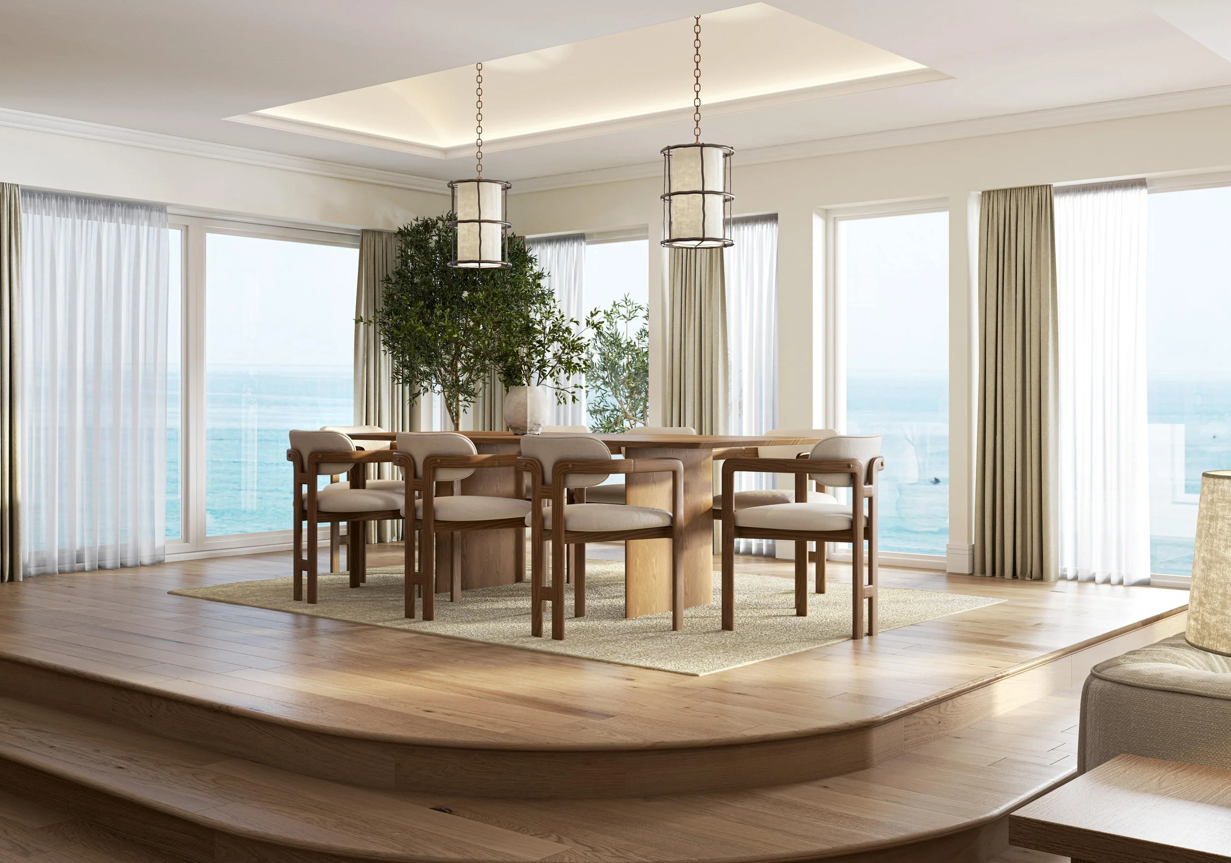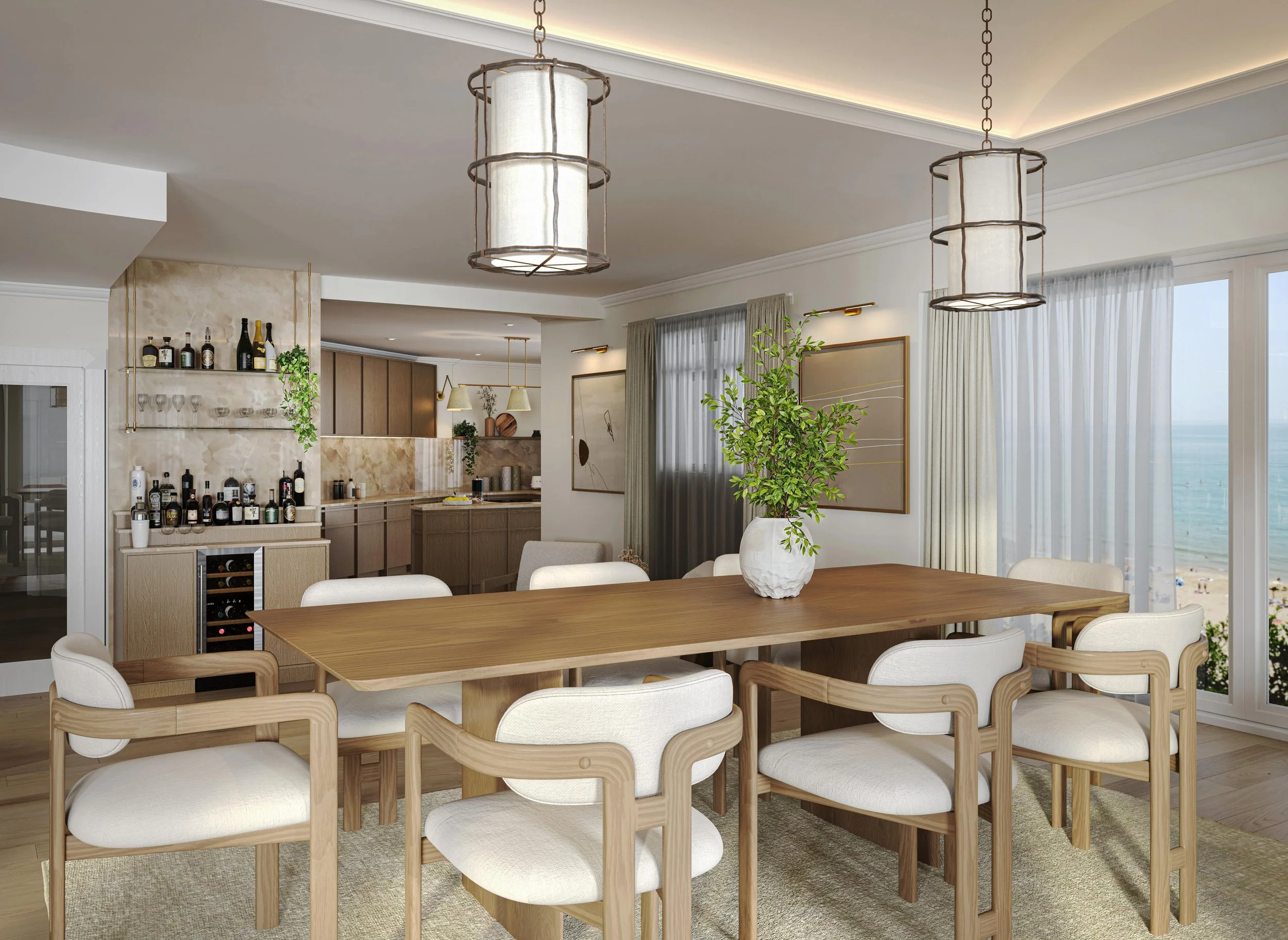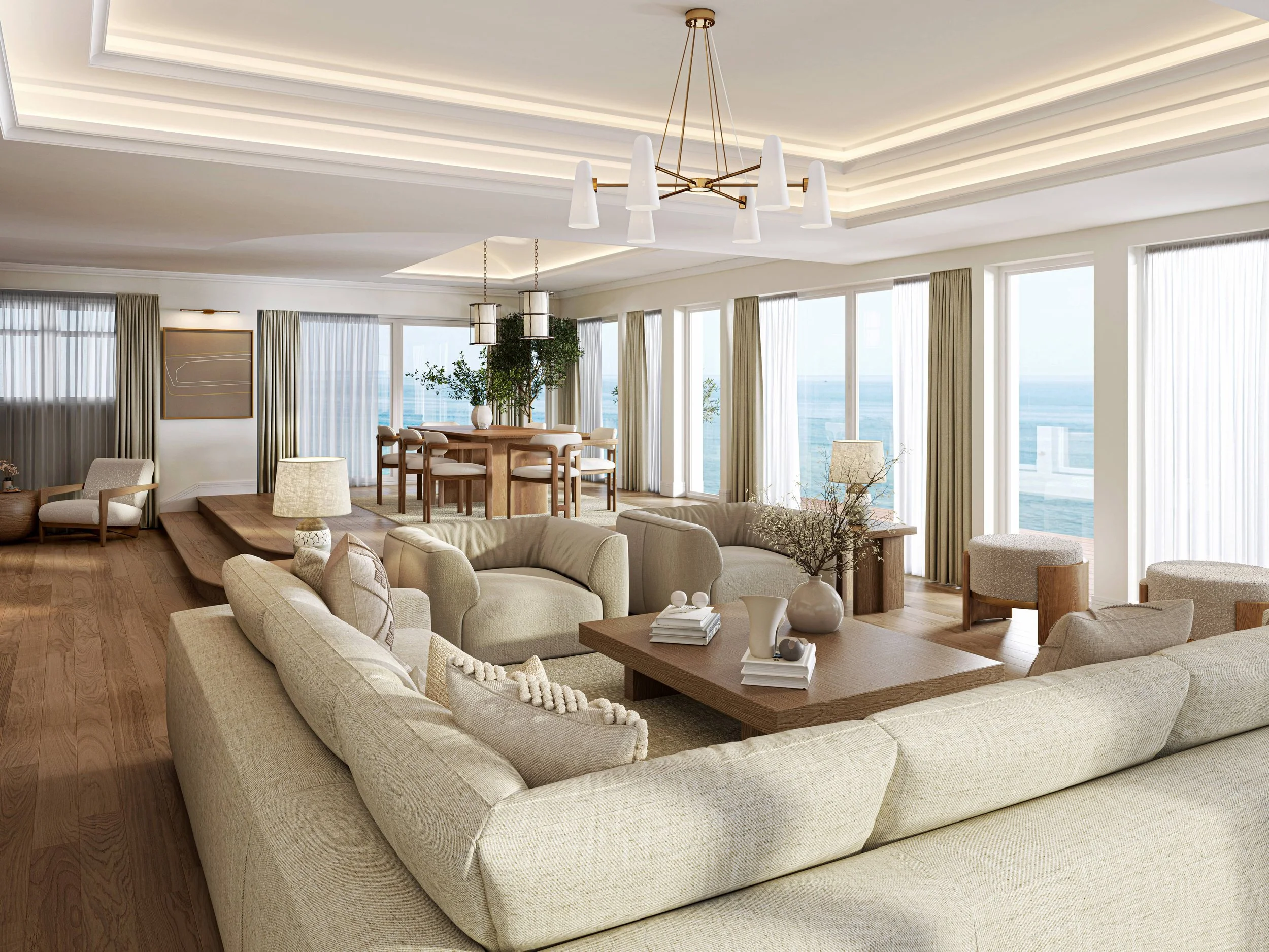 Originally appointed to provide floor plan concepts to showcase the potential of this £3.5 million penthouse, KTM Design was subsequently commissioned to produce a full interior design package. Set against breath-taking coastal views, the design embraces a refined neutral palette, allowing the scenery to take centre stage. Contemporary furniture and a statement feature wall are thoughtfully paired with traditional mouldings, creating a seamless blend of modern sophistication and classic charm. Rich wood panelling, luxurious leather seating, and a sleek marble bar elevate the living space - offering a stylish setting equally suited to relaxed evenings or elegant entertaining.