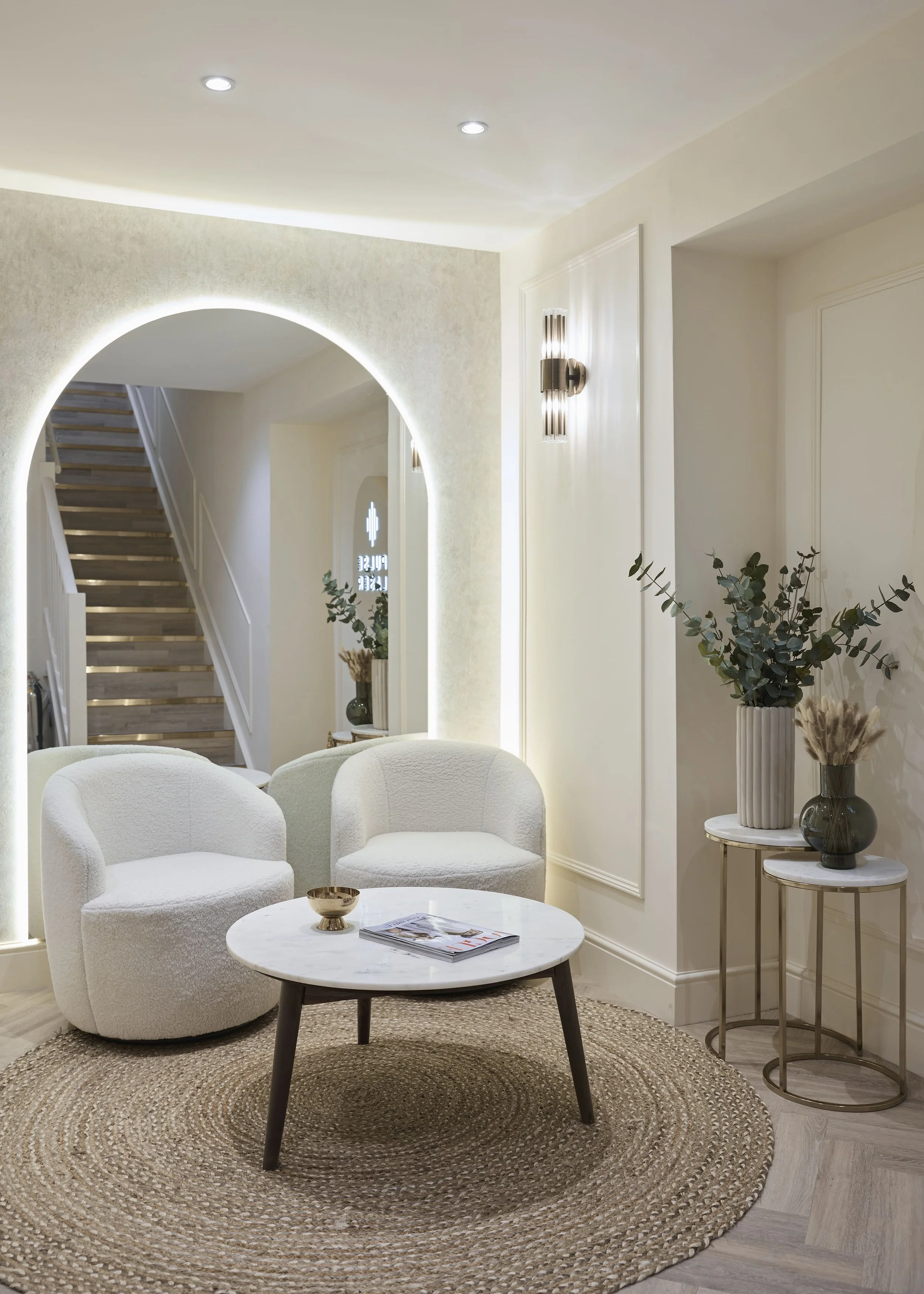 A beautiful laser clinic with refined elegance: Neutral palette, herringbone flooring, traditional panelling, feature lighting, and cosy waiting areas for comfort and relaxation.