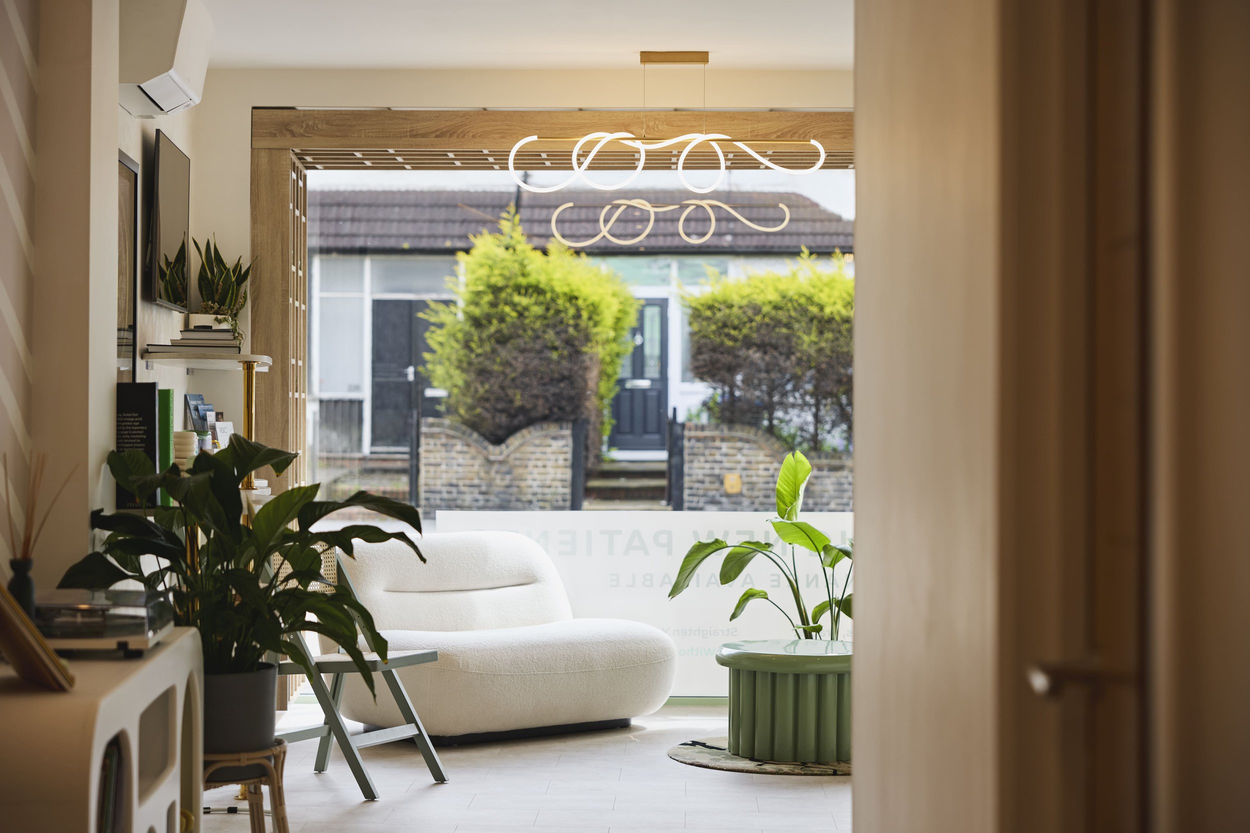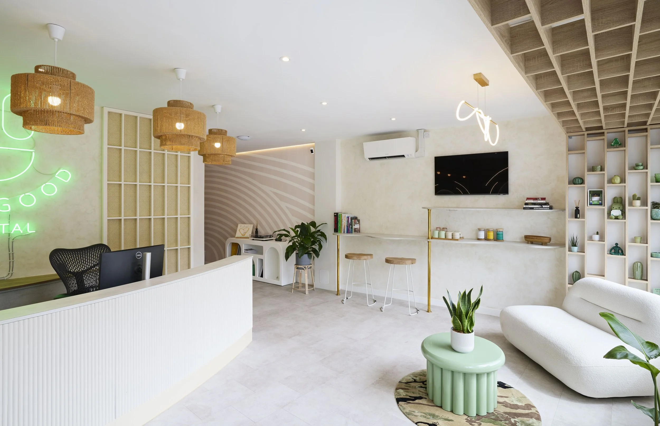 The vibrant, whimsical décor creates a unique and engaging atmosphere, anchored by a soothing base of neutral tones with lively splashes of green. Quirky touches in the waiting area appeal to all ages, while natural materials such as wood, rattan, Venetian plaster, and greenery bring warmth and promote a sense of well-being.