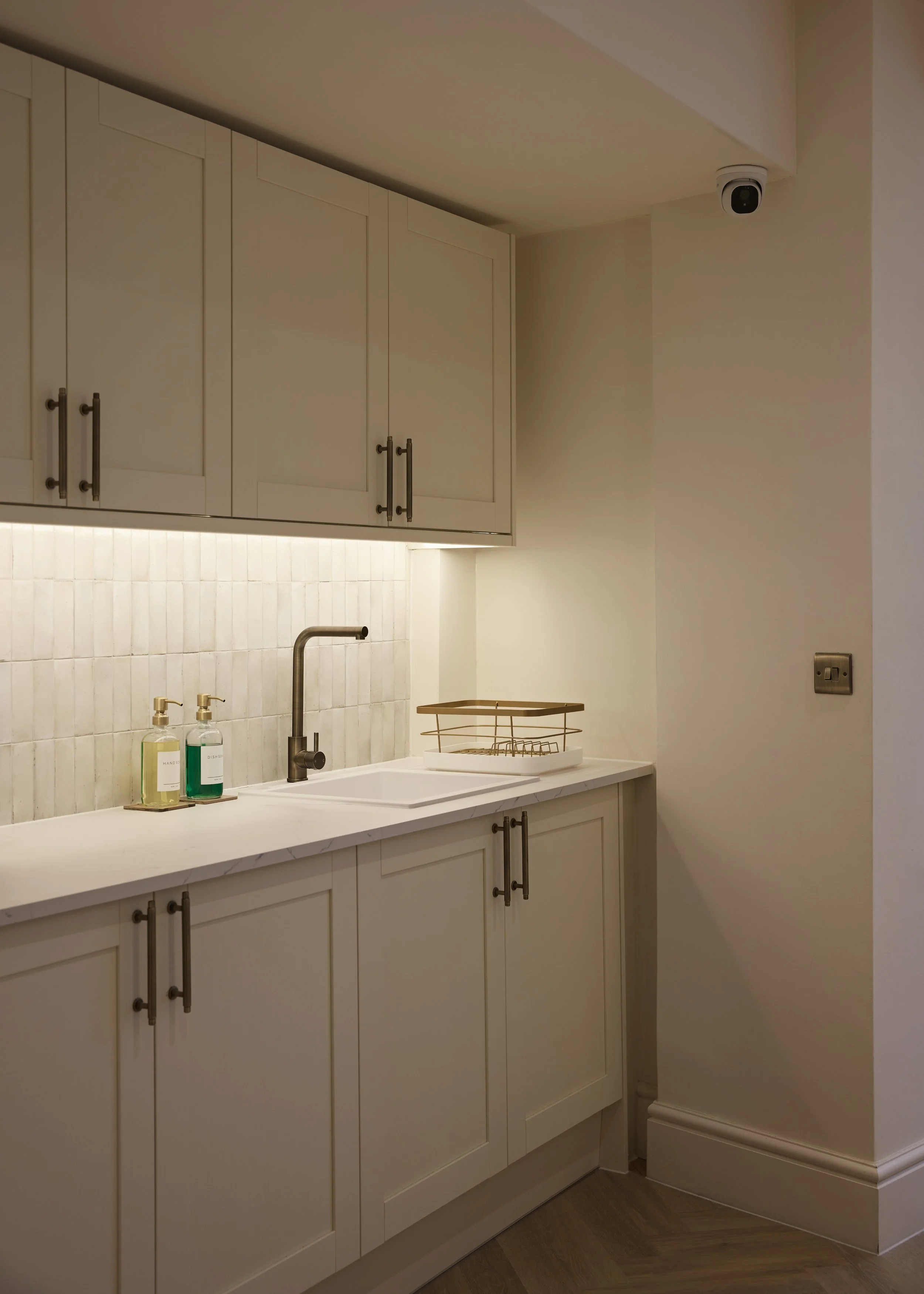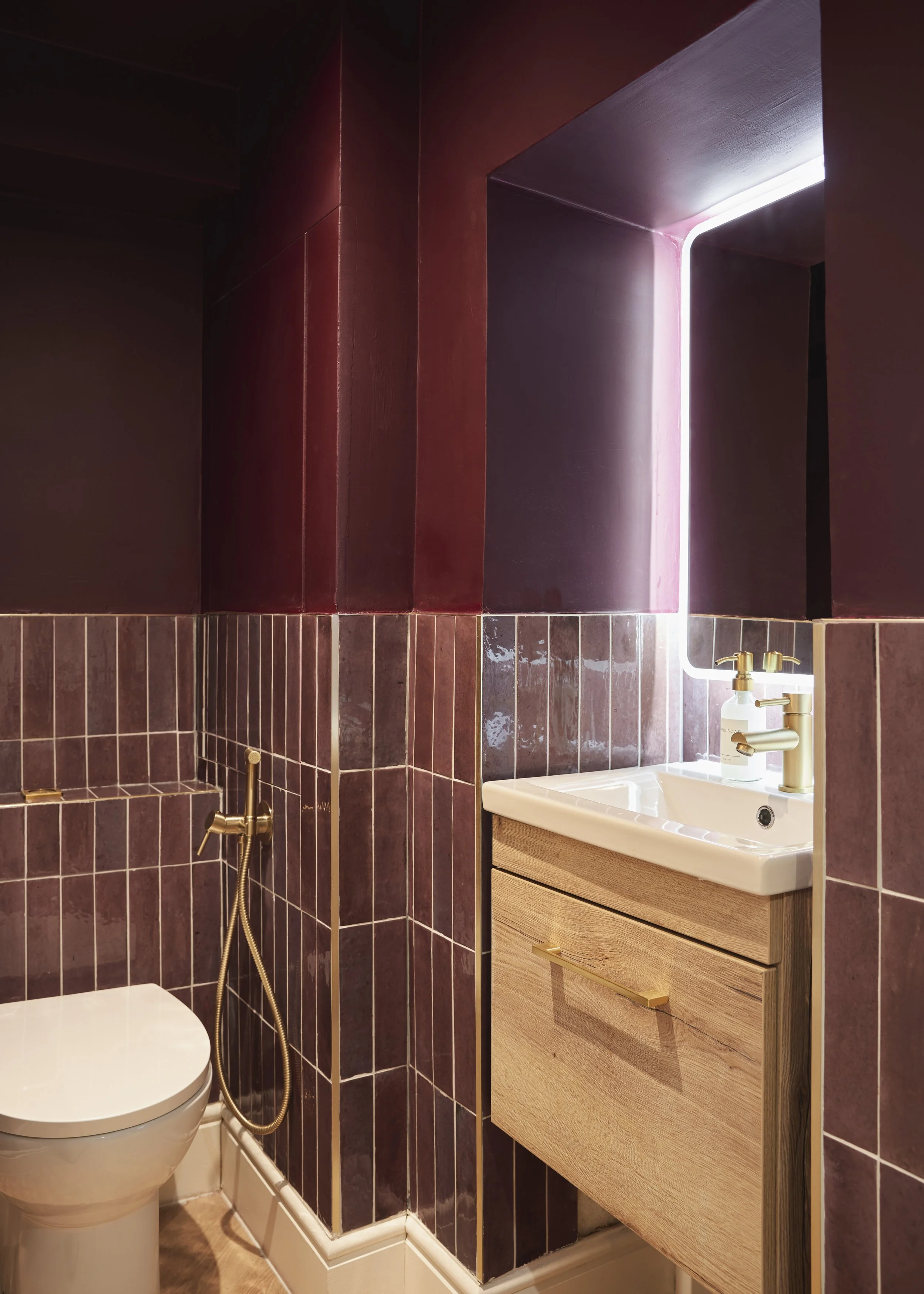 A soft, neutral colour palette is paired with architectural detailing and layered lighting to create a space that feels considered and balanced. Subtle textures and the gentle tonal contrast of the deep burgundy, rose and terracotta adds depth without overwhelming the senses, bringing warmth and sophistication to the interior.